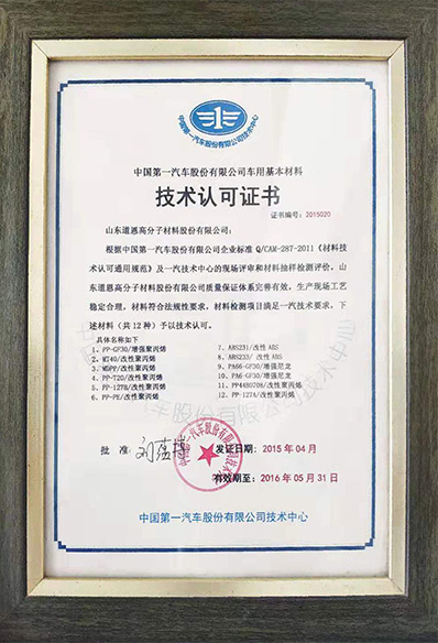 中國(guó)第一汽車(chē)股份有限公司車(chē)用基本材料技術(shù)認(rèn)可證書(shū)